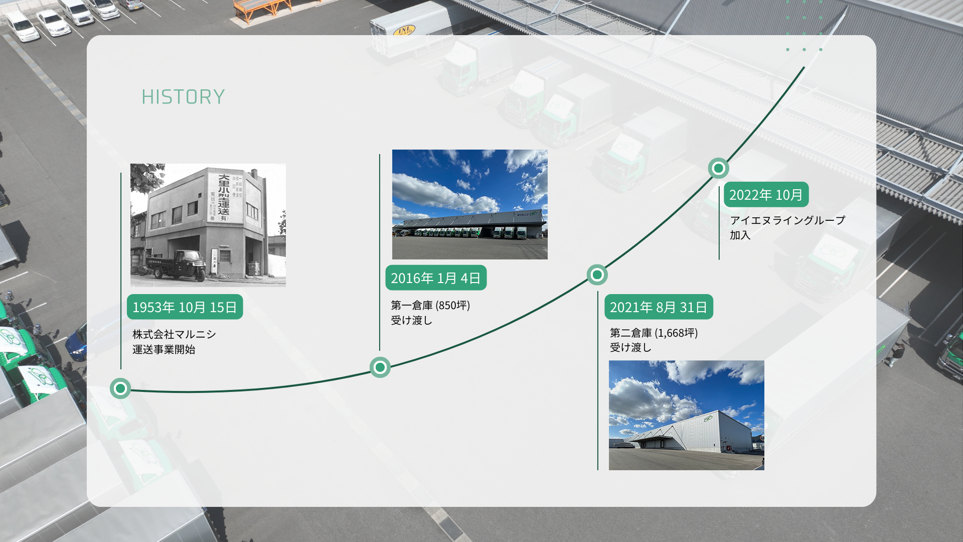| 自社倉庫坪数 | 第一倉庫:850坪 第二倉庫:1,668坪 |